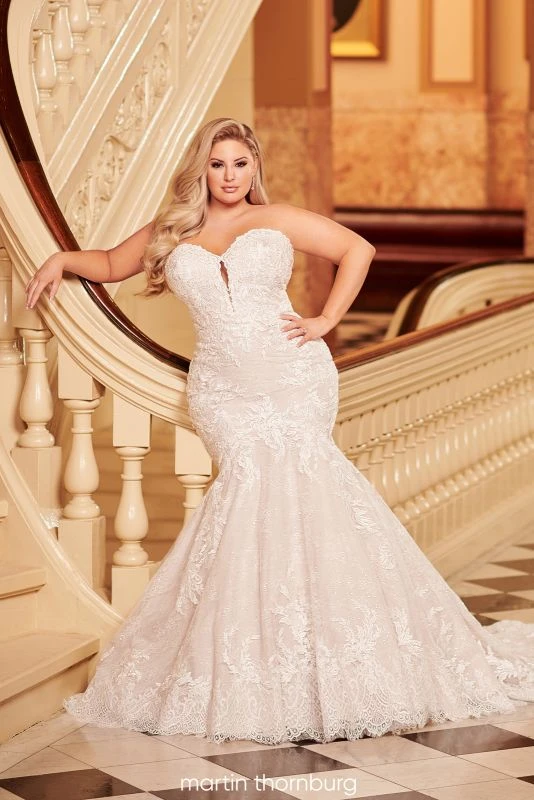 Martin Thornburg 220261W Solana strapless plus size bridal gown is styled in allover lace and sequin tulle, finished with a scalloped hem and chapel train. Dainty scallops trim the plunging sweetheart neckline, while covered buttons accent the corseted illusion back. Floral lace appliques stretch throughout this curve-hugging wedding dress. Set includes removable straps.