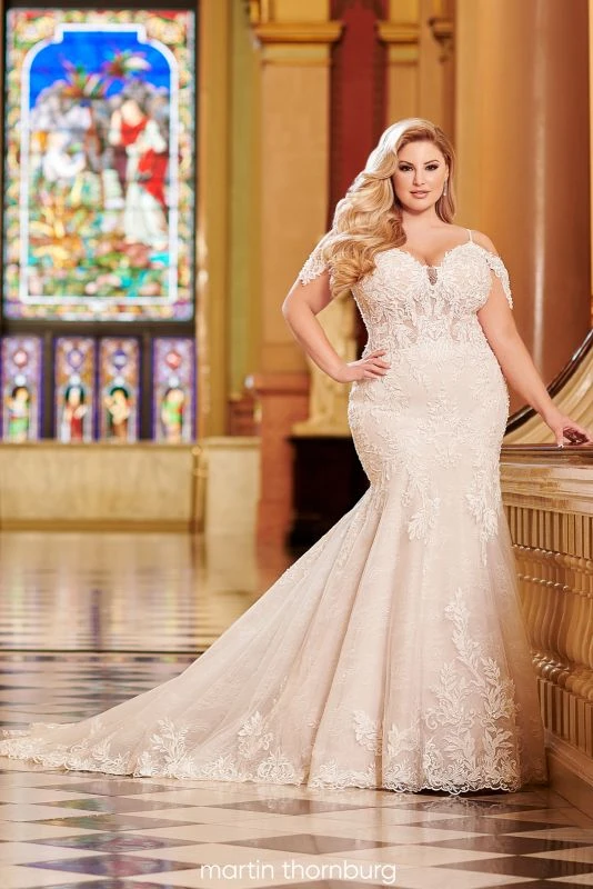 Martin Thornburg 220264W Cambria trumpet plus size wedding gown is styled in lace-appliqued tulle and allover lace, with a scalloped hem and chapel train. The semi-sheer sweetheart bodice is detailed with corset boning, beaded spaghetti straps and detachable cold-shoulder straps. Covered buttons accent the mid-rise back. Set includes a separate bodice lining.