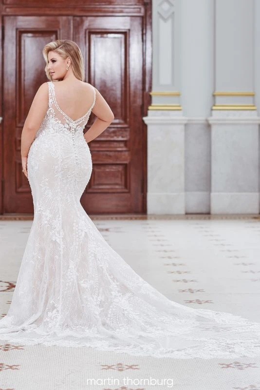 Martin Thornburg 220268W Torrance fit and flare plus size bridal gown features a corseted bodice with a deep V-neckline and a sheer low back with buttons. This sleeveless wedding dress is crafted in lace-appliqued tulle over sequin lace, jazzed up with directional embroidery for a flattering silhouette. The scalloped hem spills into an illusion cathedral train.
