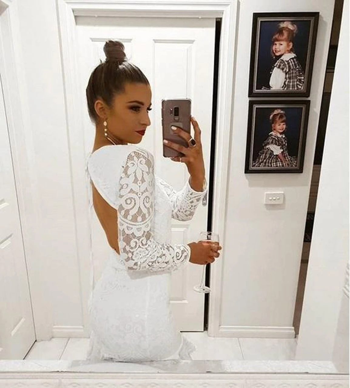 The Medindie Dress in White has gorgeous custom lace and features a high neckline, fully lined with an open back. It has an invisible center back zipper with a tie behind the neck. It is perfect for anyone looking for a sophisticated look for their next event! Perfect bridal shower dress, white dress or for a rehearsal dinner look.