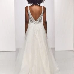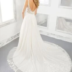 Mori Lee Bridal 2302W Brielle A-line plus size bridal dress features a semi-sheer bodice with beaded trims on the notched V-neckline and low V-back. Beaded lace appliques embellish the fitted top and lower skirt, jazzed up with beaded trim on the split-front overskirt and back. This sleeveless wedding gown is completed with covered back buttons and a chapel train. Available in regular size as Style 2302.