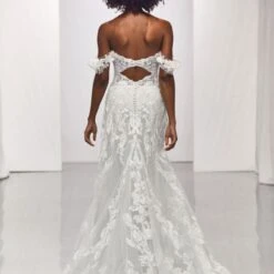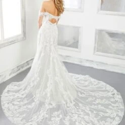 Mori Lee Bridal 2307W Blossom A-line plus size bridal gown features a notched sweetheart bodice with detachable off-the-shoulder sleeves and cutout back. This two-way wedding dress is crafted in beaded embroidered net over glitter tulle, finished with covered back buttons, horsehair hem, and chapel train. Available in regular size as Style 2307.
