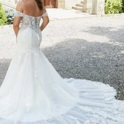 Mori Lee Julietta 3289 Sophie trumpet-style plus size wedding dress is crafted in embroidered tulle, with a sweetheart neckline and detachable sleeves. Illusion sides blend into the lace-up illusion back, offset with a lace-trimmed petal train. Crystals and diamante beading lends glitz to this curve-hugging bridal ballgown.