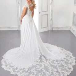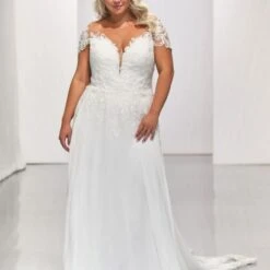 Mori Lee Julietta 3311 Barbara A-line plus size bridal dress features a plunging sweetheart bodice with illusion cap sleeves and cutout back. Embroidered lace appliques embellish the fitted top and the cutaway chapel train. Covered back buttons complete this look.