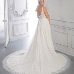 Mori Lee Julietta 3321 Chrissy A-line plus size bridal dress features an embroidered bodice with a curved V-neckline, slim straps and illusion scoop back. Layers of English Net comprise the full skirt, finished with a left-leg slit and a lace-appliqued chapel train. Covered back buttons complete this look.