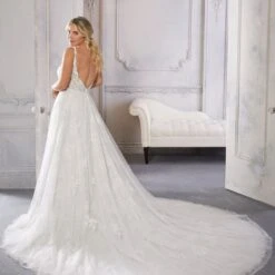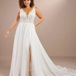 Mori Lee Julietta 3330 Clementina A-line plus size bridal dress is styled in embroidered net over sequin lace, with a deep V-neckline and an open V-back. A slim bow belt tops the full skirt, detailed with a left-leg slit and a semi-cathedral train. Clear and crystal beading lends glitz to this romantic wedding gown, finished with covered back buttons. Ships with extra lace appliques.