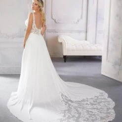 Mori Lee Julietta 3331 Caroline A-line plus size bridal gown features a beaded embroidered net bodice with a plunging V-neckline and low scoop back. The chiffon skirt cascades to a scalloped cutaway train with matching embroidery appliques. Covered back buttons complete this look. Ships with extra lace appliques. Available with corset back as Style 3331C. Available with front bodice lining as Style 3331LB.