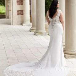 Mori Lee Julietta 3343 Evie slim-flare plus size wedding gown features a sheer lace bodice with a sweetheart neckline, scoop back and removable cap sleeves. Matching embroidery appliques embellish the crepe skirt, finished with covered back buttons that point to the cutaway lace chapel train.