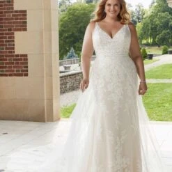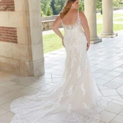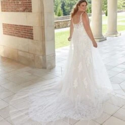 Mori Lee Julietta 3347 Esme slim-flare plus size wedding gown is styled in floral embroidery, with crystal trims on the V-neckline and illusion scoop back. Covered back buttons point to the sheer petal-shaped chapel train. A removable thin beaded waistband tops the cathedral-length tulle overskirt.