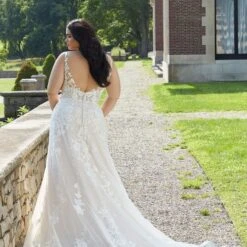 Mori Lee Julietta 3349 Erica A-line plus size wedding dress features a semi-sheer bodice with illusion straps edging the V-neckline and open scoop back. Beaded floral embroidery stretches all over this sleeveless bridal gown, finished with covered back buttons and a chapel train.