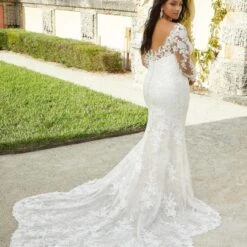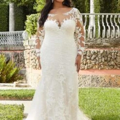 Mori Lee Julietta 3362 Gillian fit and flare plus size bridal gown is styled in embroidered net on allover lace, finished with covered back buttons and a petal train. The sweetheart-lined bodice is topped with an illusion yoke that defines the illusion scoop neckline, illusion long sleeves and illusion back.