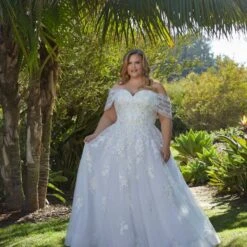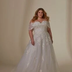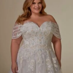 Mori Lee Julietta 3391 Lorraine plus size bridal dress features a corset top with a strapless sweetheart neckline and removable off-the-shoulder pleated sleeves. Beaded floral embroidery luxuriously embellished this tulle wedding ballgown, finished with covered buttons on the mid-rise back, a horsehair hem, and a chapel train.