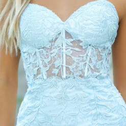 Be chic in the Reva Mini Dress! A shorter version of our Reva Gown, this mini is a fun and sexy dress with an applique corset bodice and a strapless sweetheart neckline to go with a beautiful fitted figure. Detailed with gems for a a subtle sparkle and a floral applique, it also displays a lace up back detail. this look is perfect for a cocktail party, homecoming, night out, wedding guest, or any special occasion!