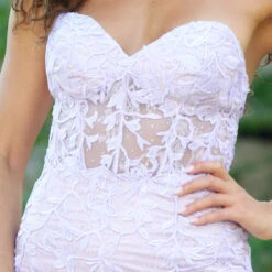 Be chic in the Reva Mini Dress! A shorter version of our Reva Gown, this mini is a fun and sexy dress with an applique corset bodice and a strapless sweetheart neckline to go with a beautiful fitted figure. Detailed with gems for a a subtle sparkle and a floral applique, it also displays a lace up back detail. this look is perfect for a cocktail party, homecoming, night out, wedding guest, or any special occasion!