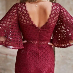 The Reyna Dress in Red is a one of a kind lace midi dress. It features a sweetheart neckline with delicate custom lace detailing on the bodice. The on-trend flute sleeve detail ends at the elbow and the high-low mermaid skirt featuring double layered ruffles.