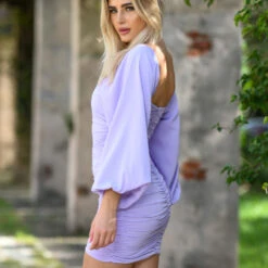 Be show stopping in the Rhea Mini Dress- Lilac! This stunner features ruching along the hips and back and has a beautiful curve hugging fit! The long sleeves can be worn on or off your shoulders for your personal preference! The dress is completed with a zipper in the back and a stretch fabric to move easily in! This dress is perfect for your next graduation, formal, bridal shower, engagement photos, date night or night out with friends!