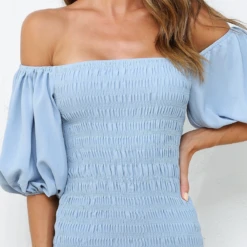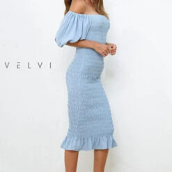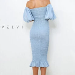 The Skyla Shirred Midi Dress in Light Blue by Velvi is a simple and elegant style that you’ll feel your best in! Adding a hint of drama with the puff lantern sleeve detail and a shirred body style makes it the perfect wear-all-day style.