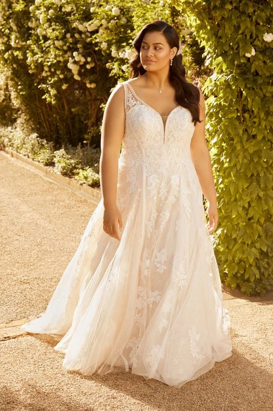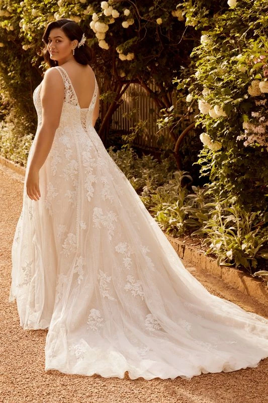 Sophia Tolli Y12246LB Madison A-line wedding gown is fashioned in allover lace, with accent trims on the narrow plunging neckline and illusion straps. Linear lace trims and floral appliques richly embellish this sleeveless bridal dress, with a low laced-up back and chapel train. Available with a zipper back and covered buttons as Style Y12246.