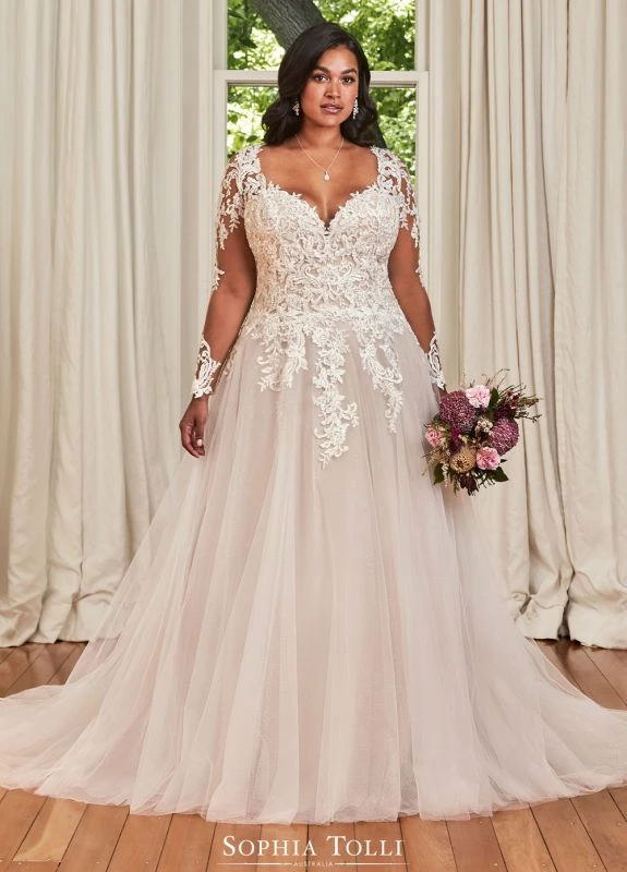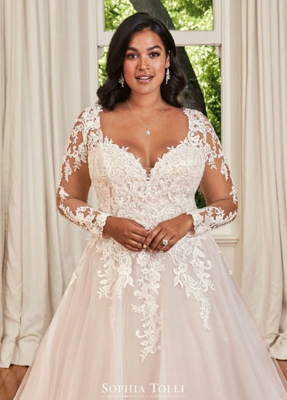 Long illusion sleeves frame the sweetheart neckline and the illusion back of this Sophia Tolli Y21977BLS Stephanie Grace tulle bridal ball gown. This dress is styled in misty tulle and glitter tulle, embellished with beaded Schiffli lace appliques. Covered buttons accent the back and the full skirt finishes in a chapel train. Available in sizes 0-28