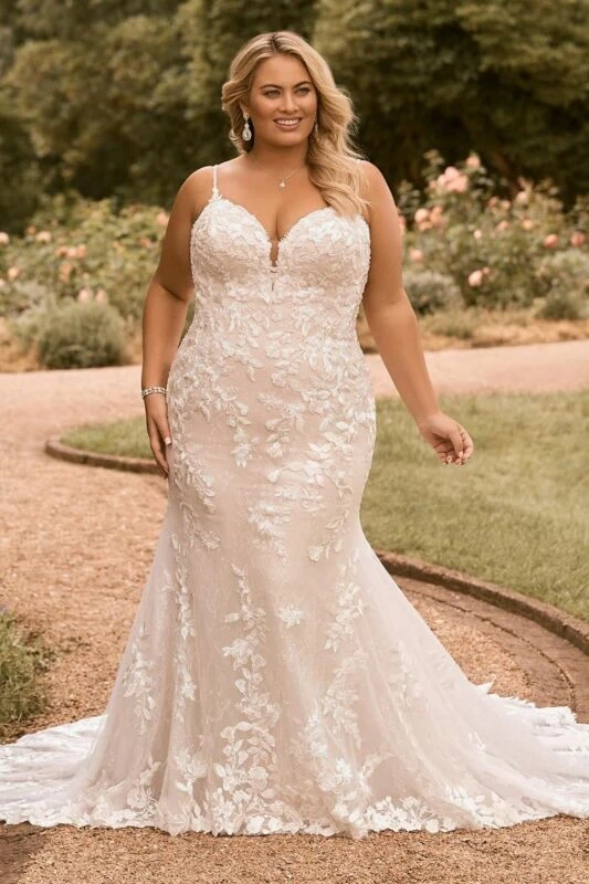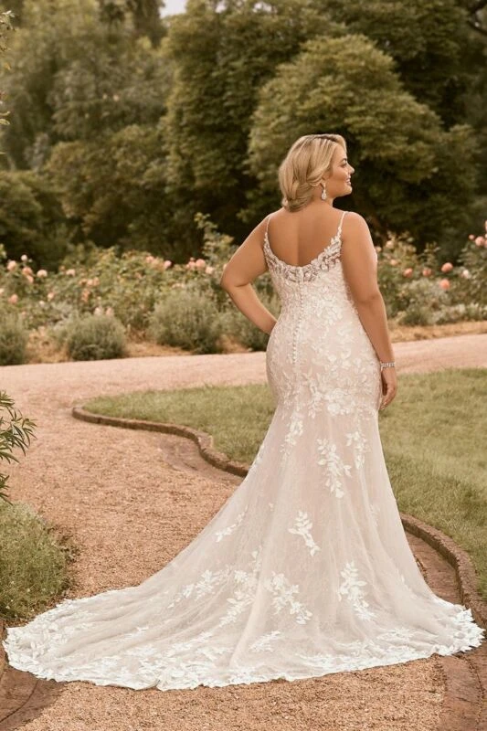 Sophia Tolli Y22171HB Valentina fit and flare plus size bridal gown features a notched sweetheart neckline, beaded spaghetti straps and illusion scoop back. This curve-hugging wedding dress is fashioned in soft tulle over lace, with beaded floral appliques stretching luxuriously from the bodice to the chapel train. Covered buttons trim the back zipper. Available with a lower back and unlined sides as Style Y22171.