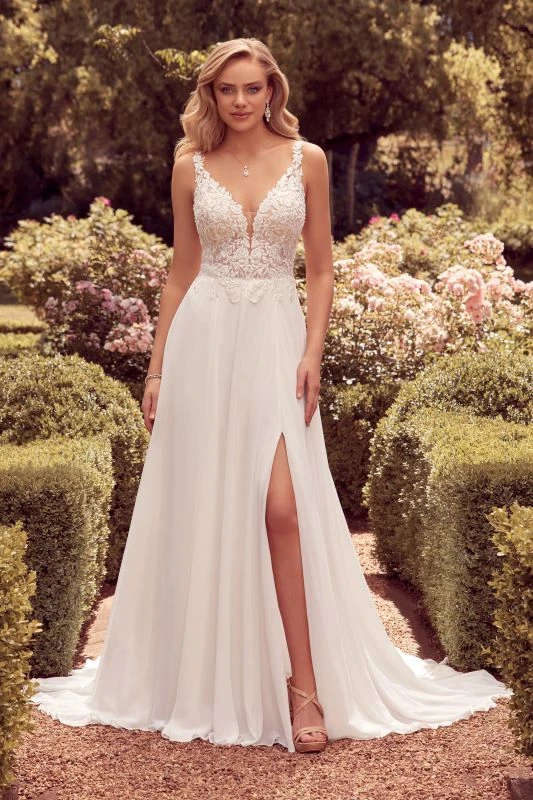 Sophia Tolli Y22178HB Luella A-line plus size wedding dress features a lace-appliqued bodice with a mesh insert plunging neckline and illusion straps. The semi-sheer bodice is complemented with a flowing chiffon skirt, detailed with a side-front slit and a chapel train. Covered buttons accent the V-back. Available with a lower back as Style Y22178. Available without slit as Style Y22178HBFI.