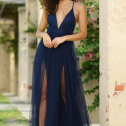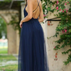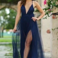 Elegant Navy Blue tulle maxi dress features a plunging V neck on a fitted, ruched bodice, adjustable criss-cross spaghetti straps, mesh overlay, and double slit skirt with an invisible zipper closure in back. Model is wearing a small. • 100% Polyester • Hand Wash Cold • LinedÂ