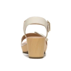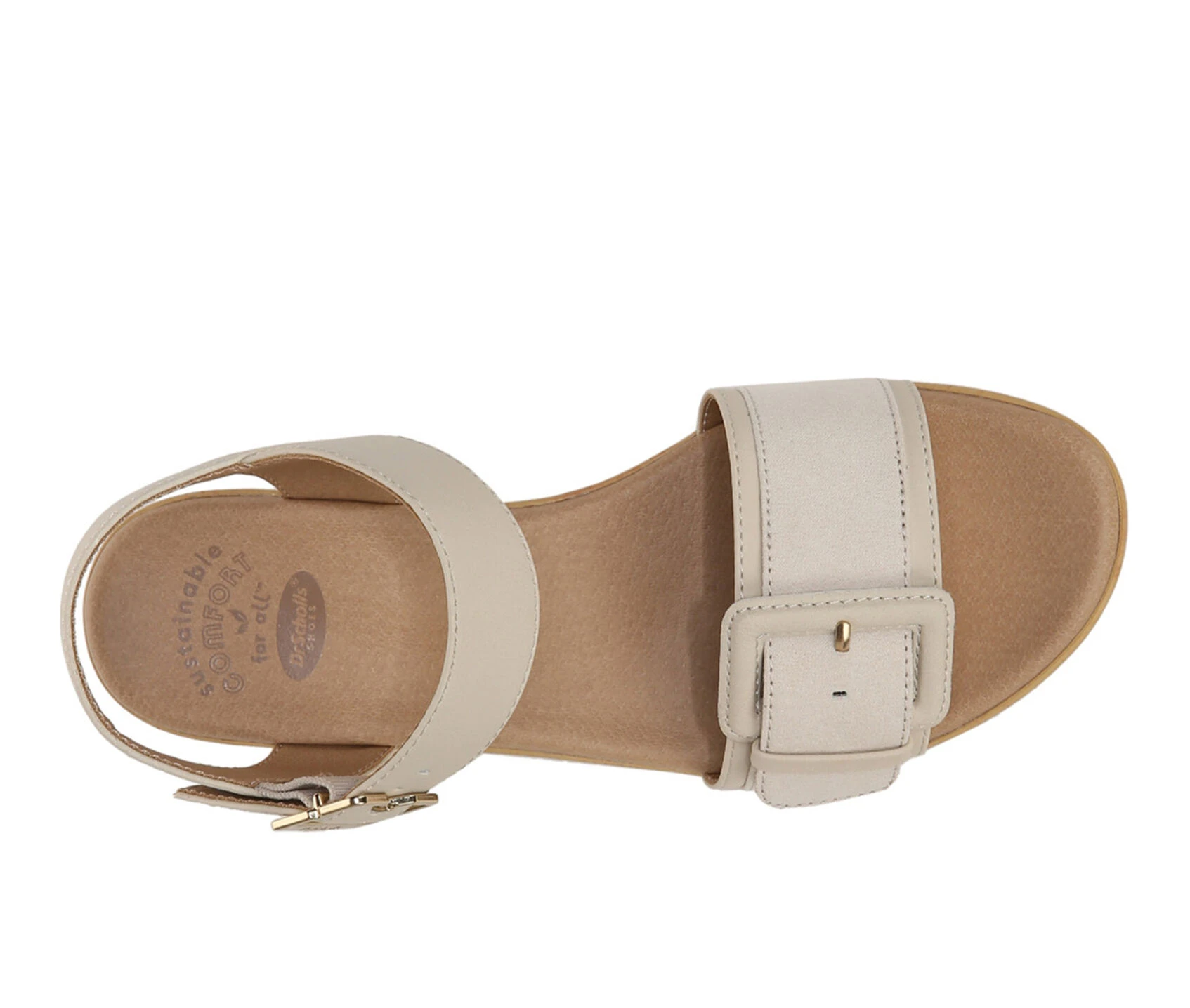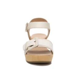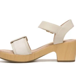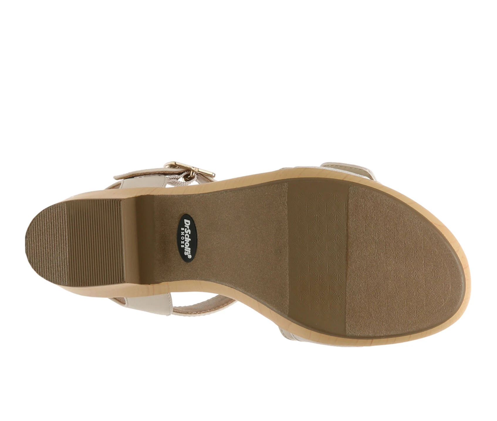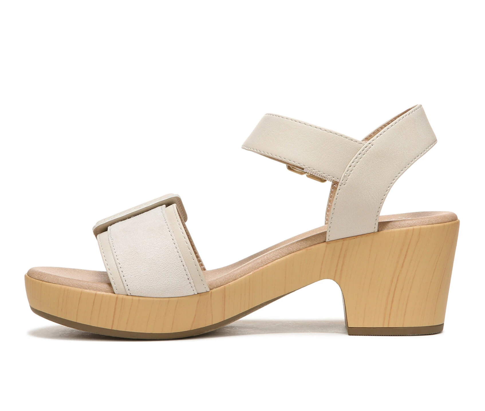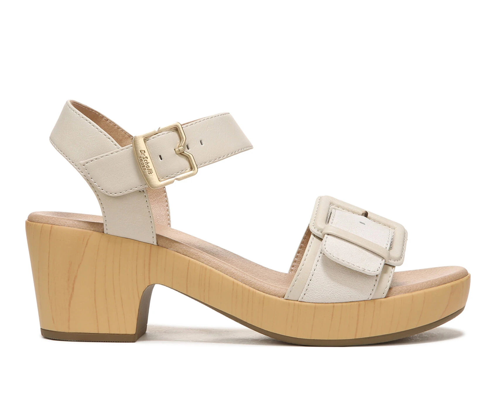 STYLE: Dress sandal with statement buckle, faux wood heel for lightweight comfort, and 2 1/3 inch platform heel.