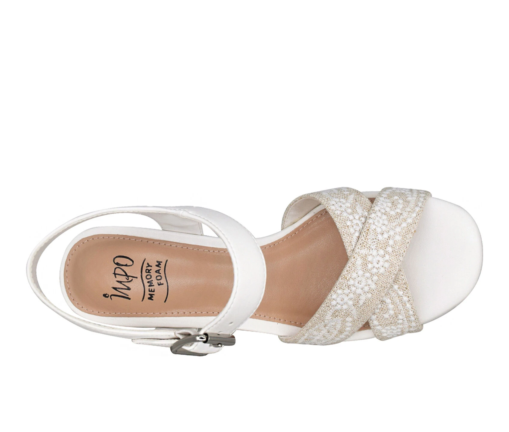 - What happens when you infuse high glamour into a summery profile? You get Impo’s elevated Ozella II platform sandal! Evoking an uplifted mood, artful linen embroidery is infused into our new square toe, bridge platform by way of flattering vamp crossbands, and beautifully wrapped platform, an eco faux suede, or vegan leather adjustable backstrap for a perfect fit, and softly cushioned memory foam to keep you comfortable all day long! Wear yours with a tie-front cutout cotton-blend midi dress, while the white color is a perfect bridal shoe for a destination wedding.