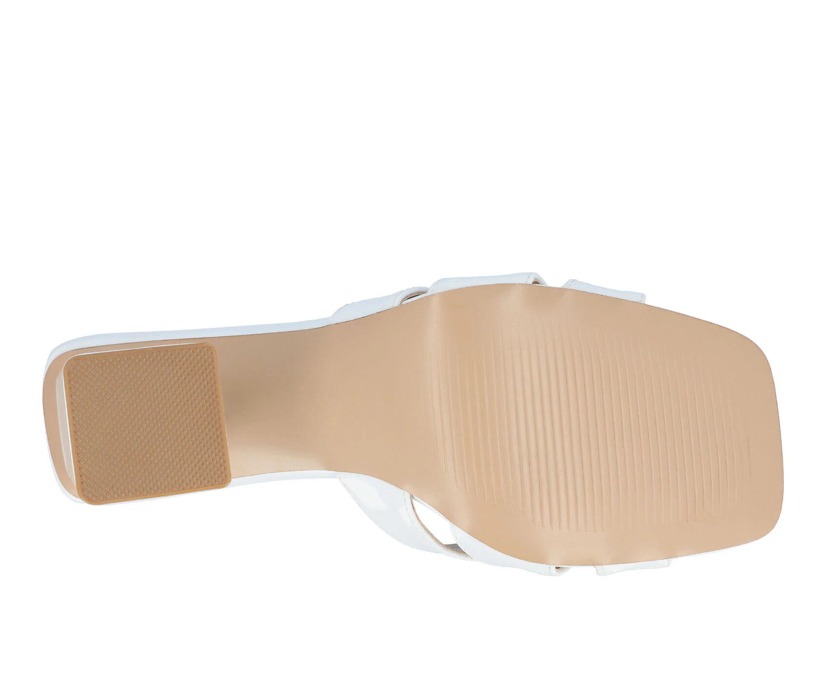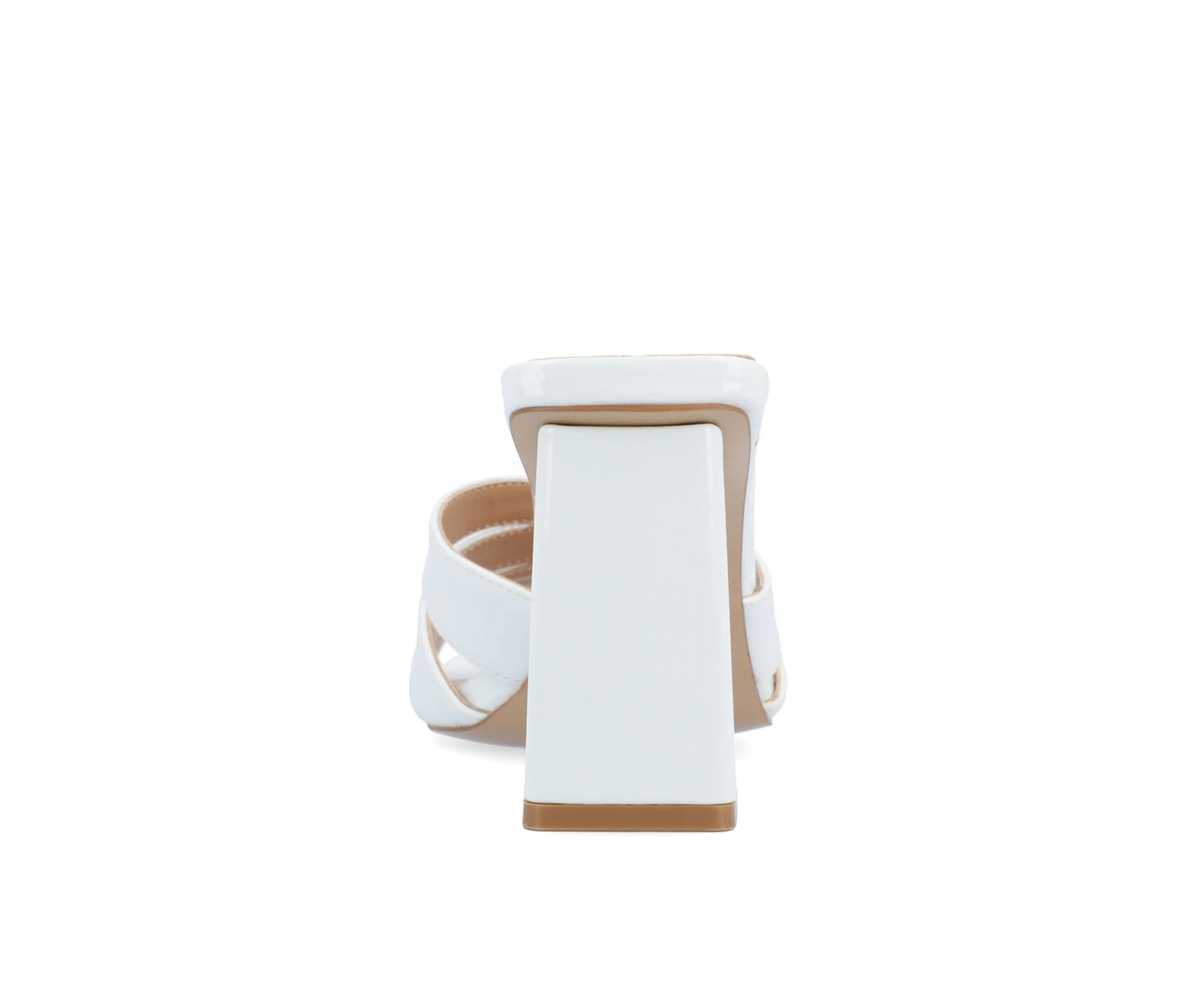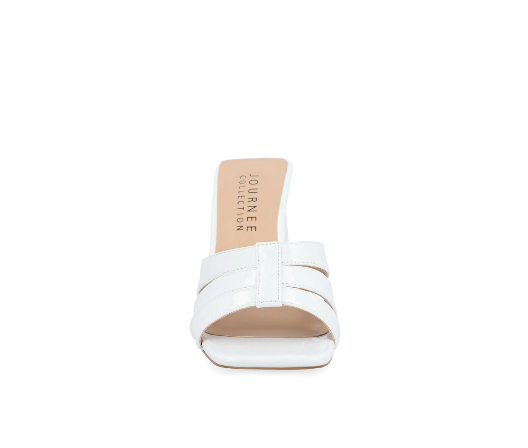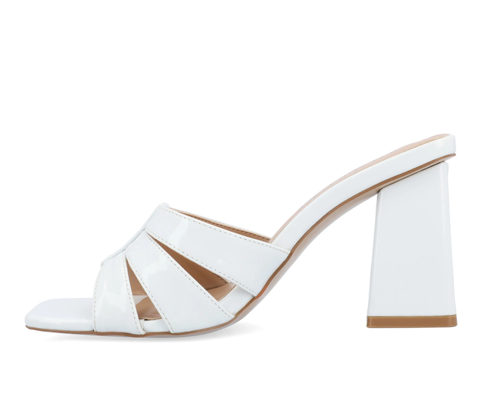 - Our Ellington block heeled sandals from Journee Collection will take you from event to event in style. This style is sure to boost your confidence with their patent vegan leather, single band design, and open square toe. The padded insole and slip-on feature will leave your feet feeling more comfortable than ever.