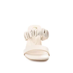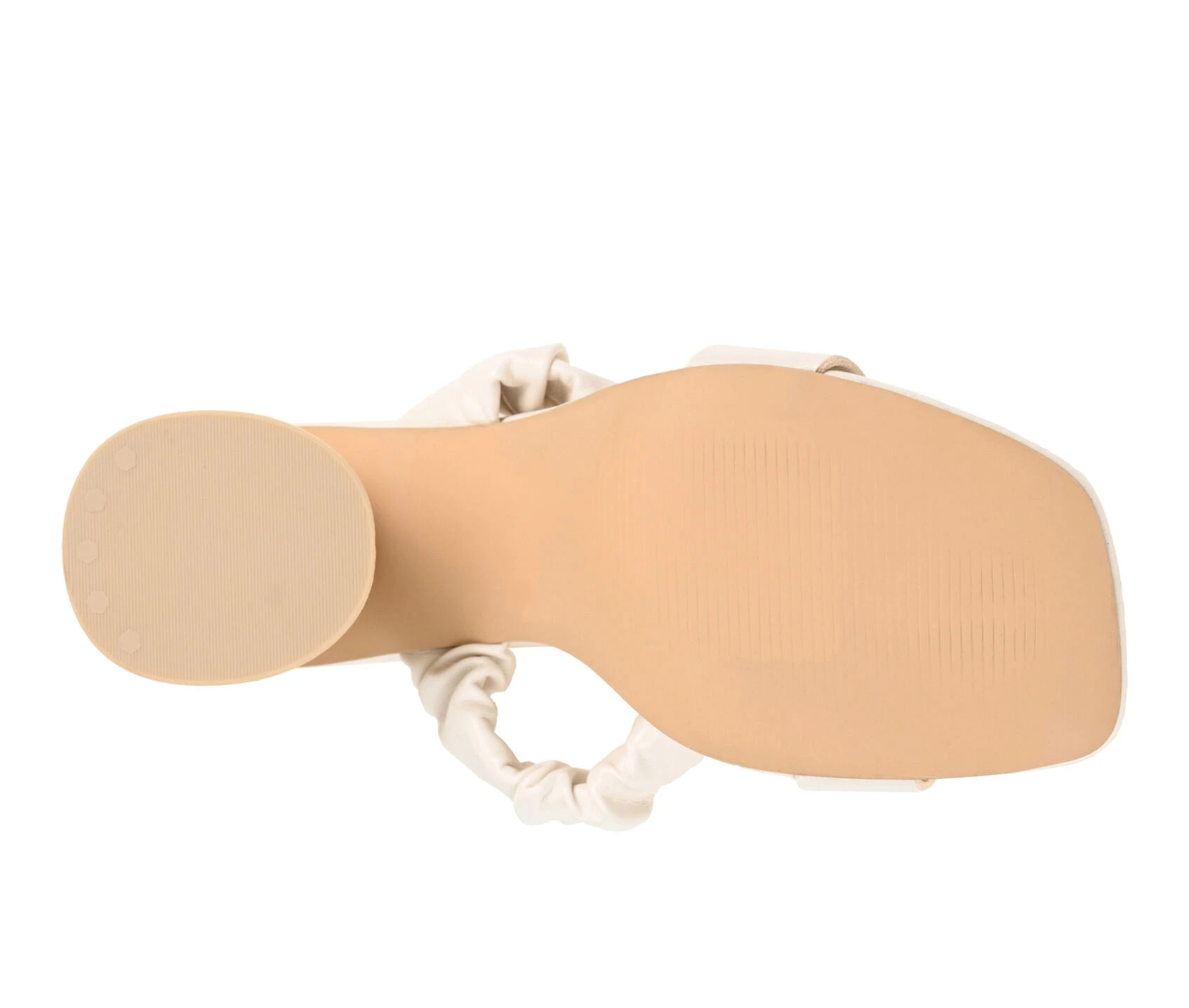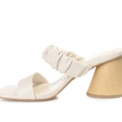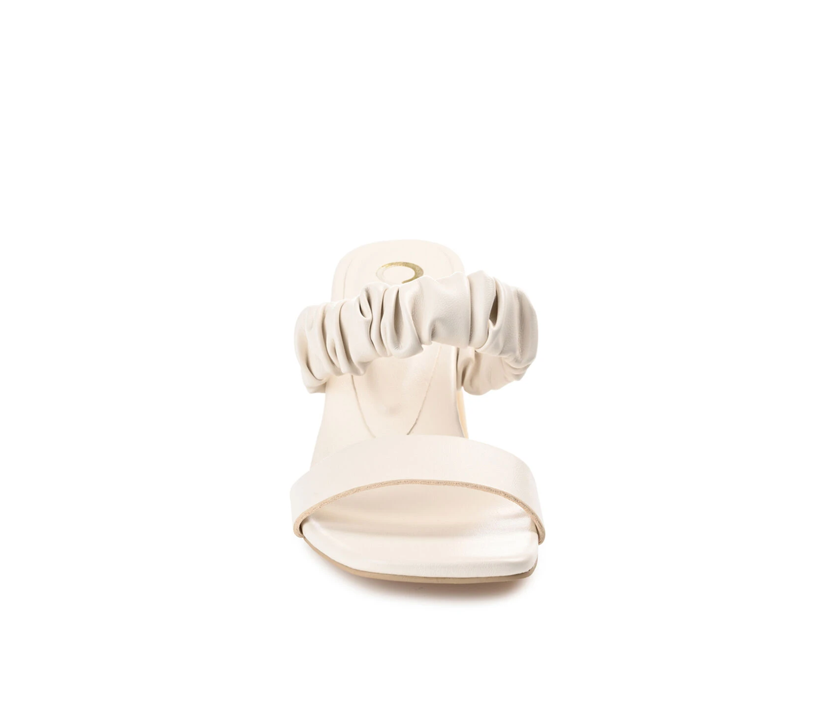 - Trendy but versatile, the Fayth by Journee Collection. This side-on-heel features a simple band at the toe complemented by a ruched strap at the vamp. Soft vegan leather and a 4 mm Tru Comfort Foam™ insole elevated by a faux wood block heel shape the design.