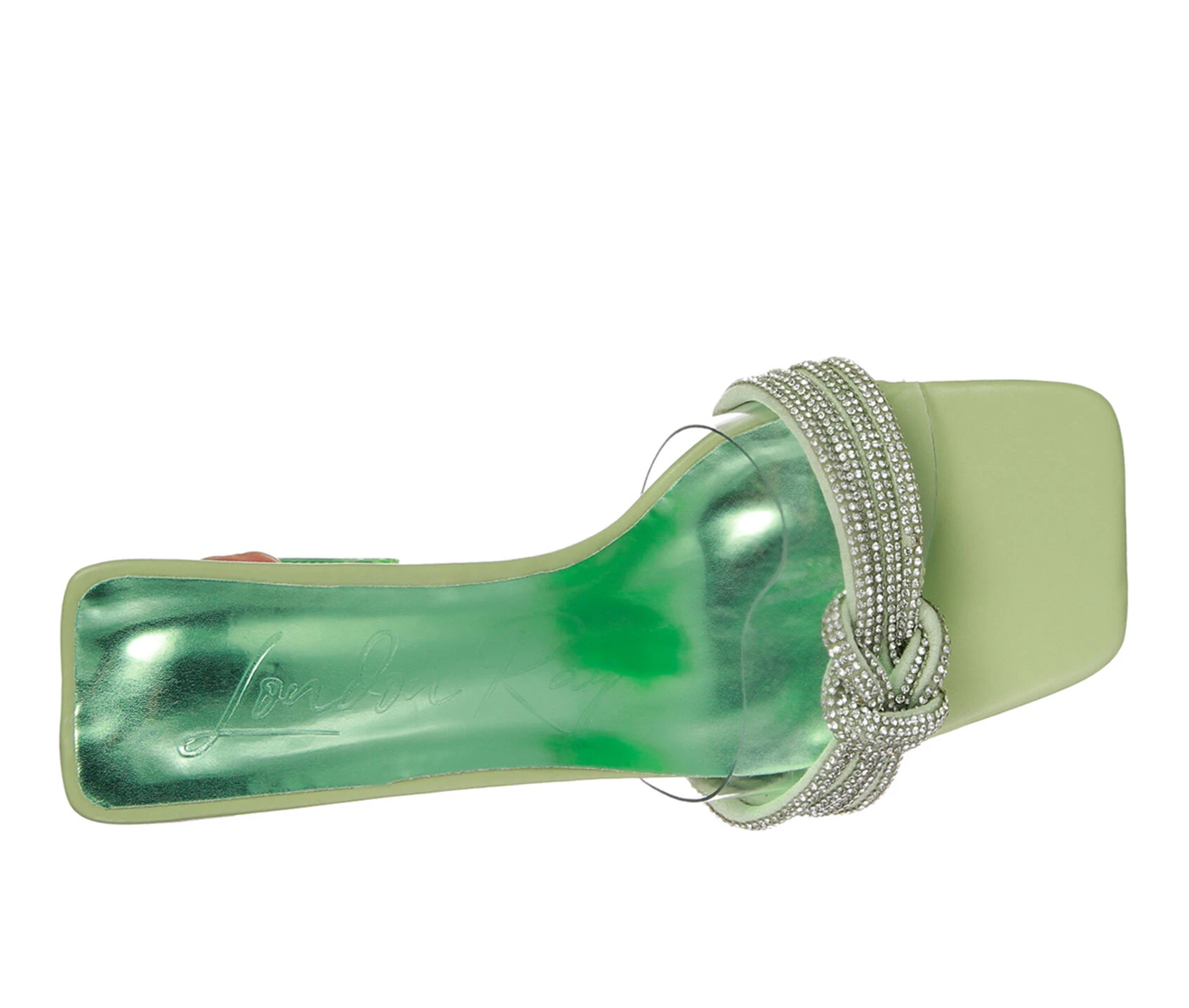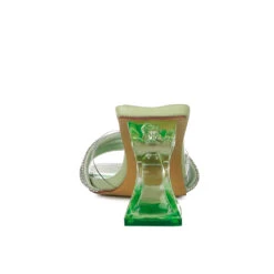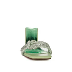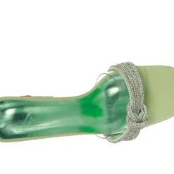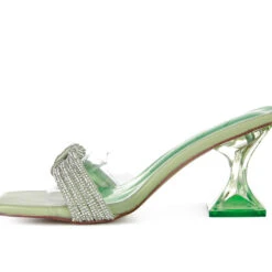 - The slip-on sandals is elegant with beautiful diamante detail knotted strap in front and clear spool heels. It has a clear broad strap that supports the decorative diamante knotted strap. The sandals are perfect for a cocktail party or fancy occasion!
