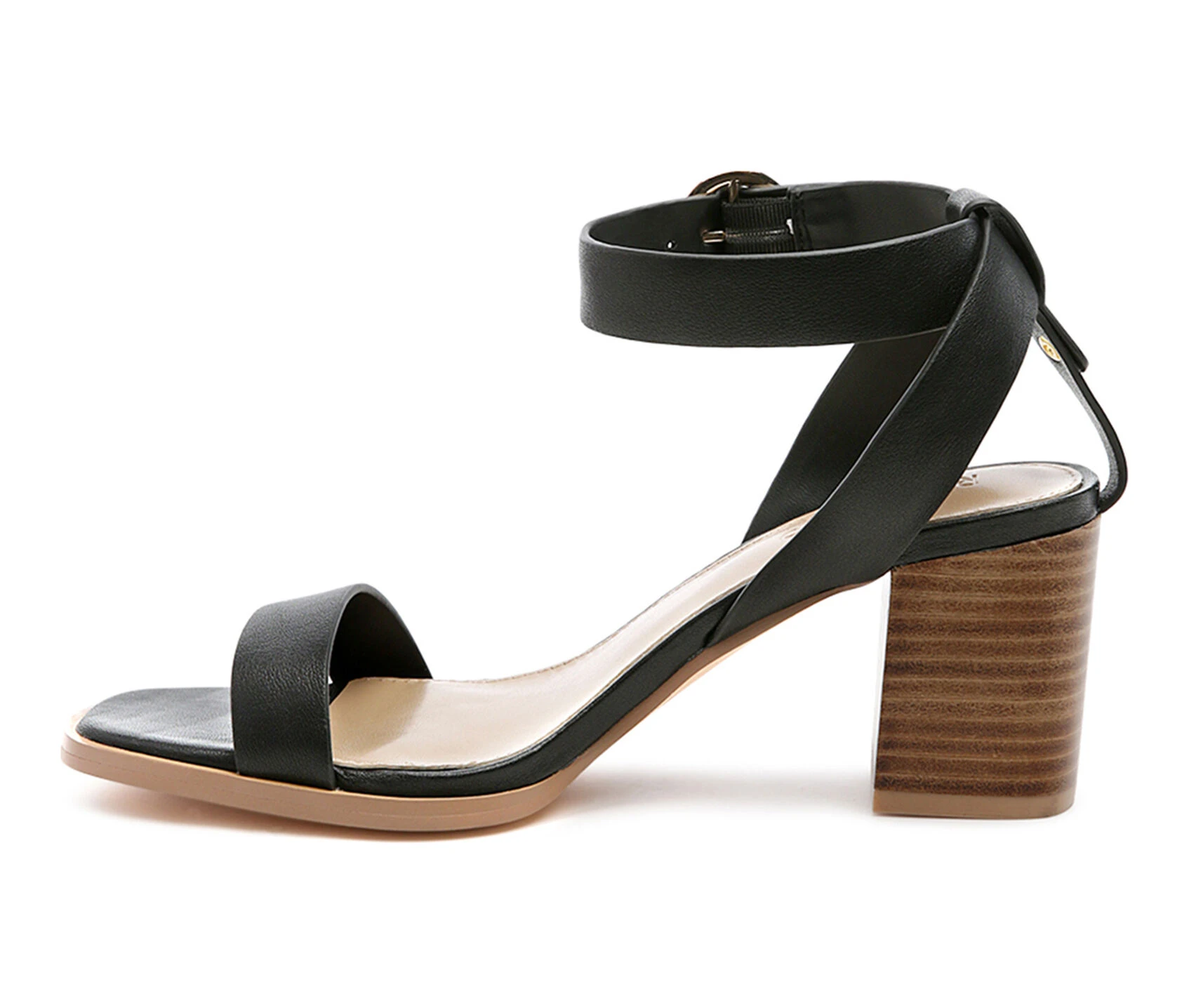 - Beautifully crafted pair of leather sandals with wooden stack heels and cushioned insole. The square toe sandal is just the statement everyday sandal you can wear to work or just keep it for all casual occasions.