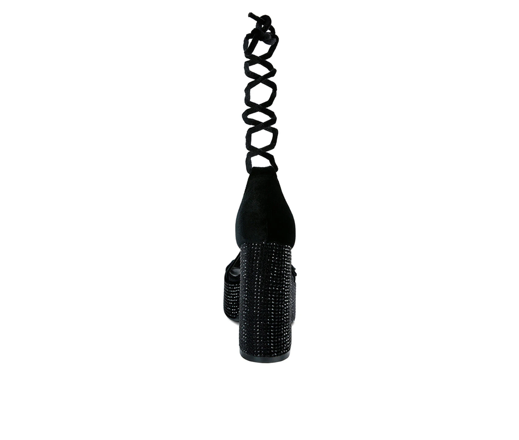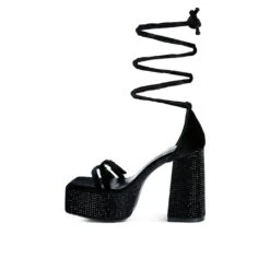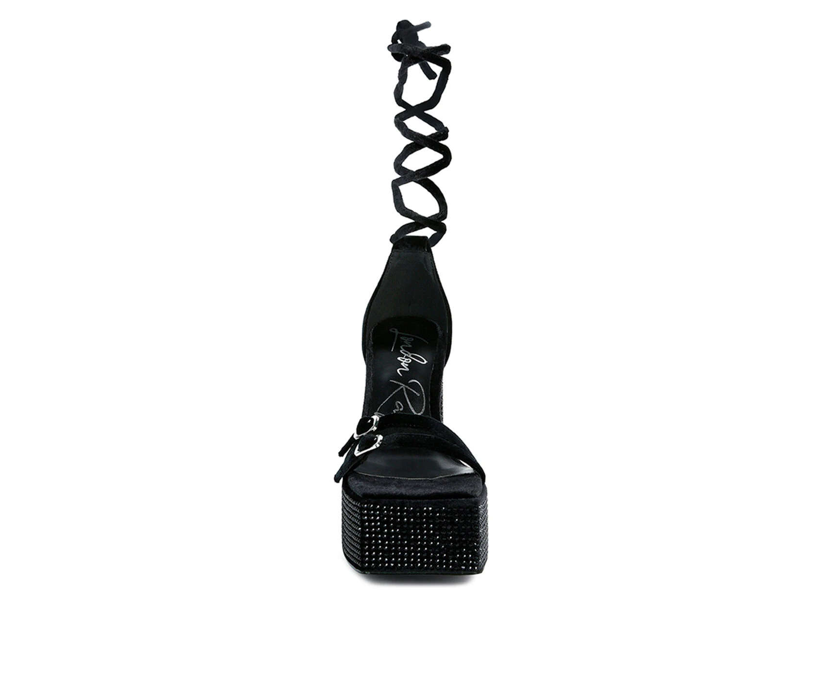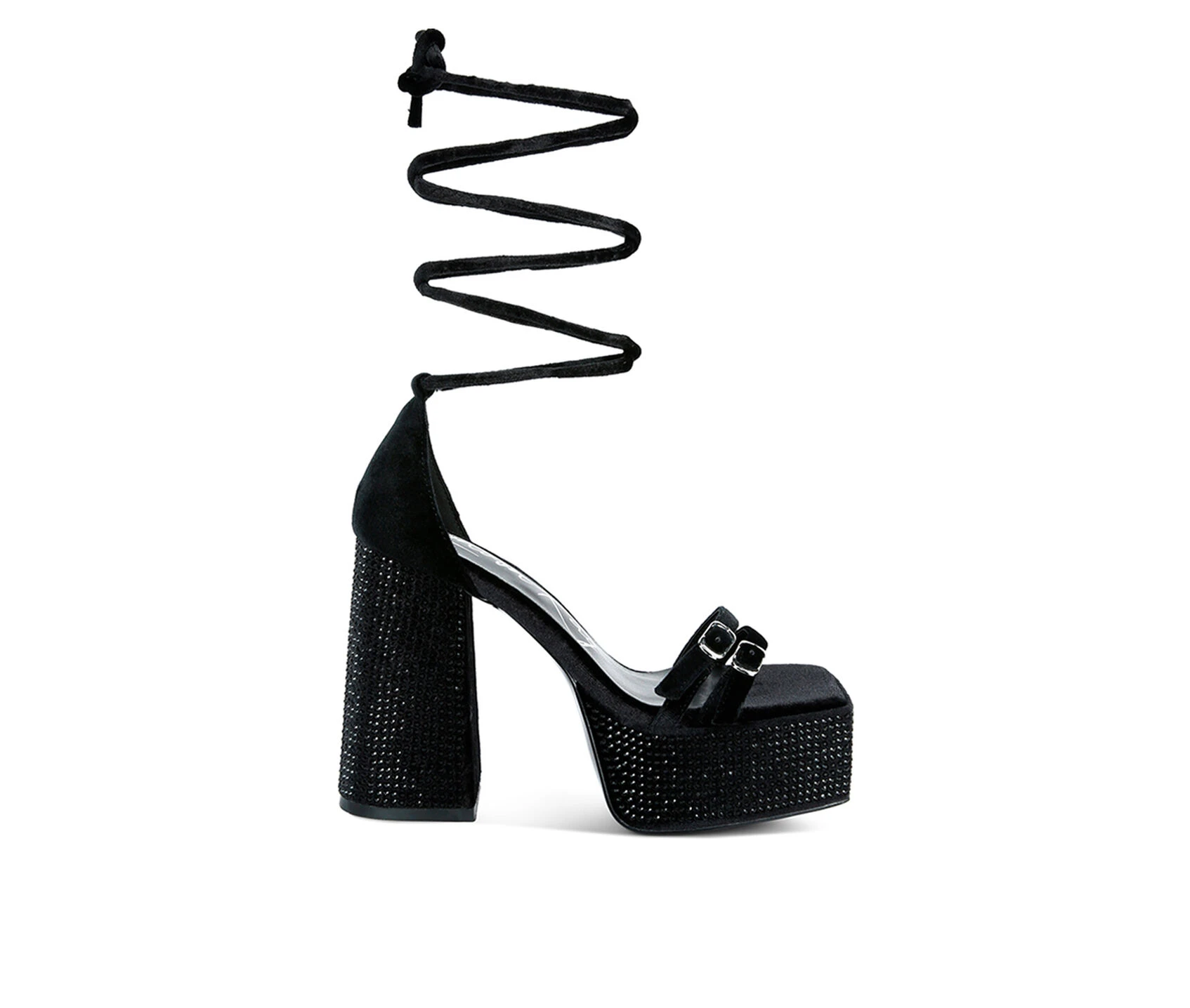 - High platform velvet sandals with pin buckle detail on thin straps is a statement casual women’s sandal. It has diamante heat set on pile cut fabric. The lace up sandal has lightly padded insole which cuts strain.