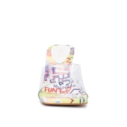 - Ready to boogie down? Do so in this California clear slide on heel sandals. Open square toe with multicolored insole for that casual , yet dressy look. You will clearly love these.